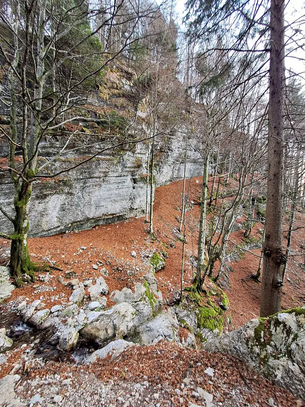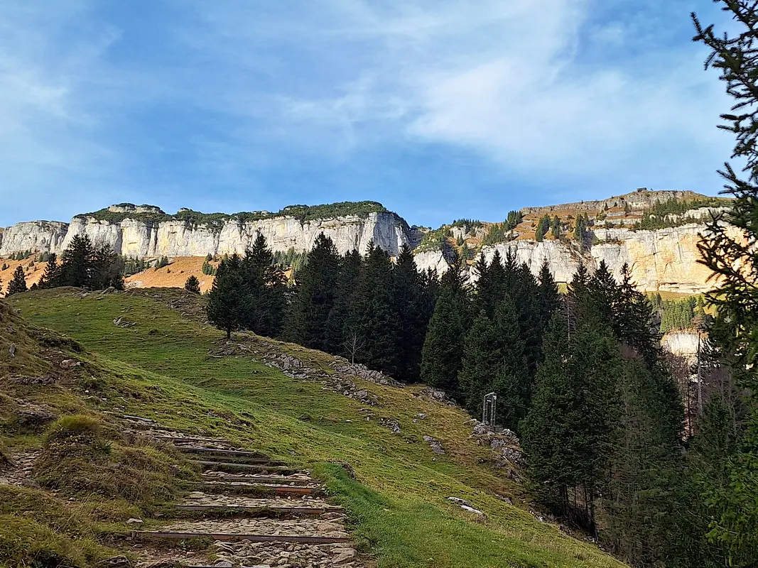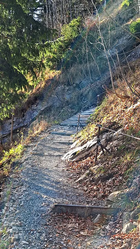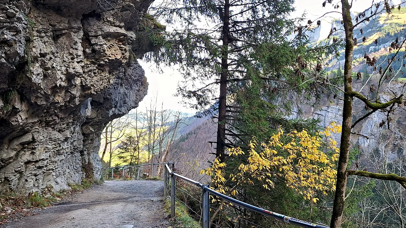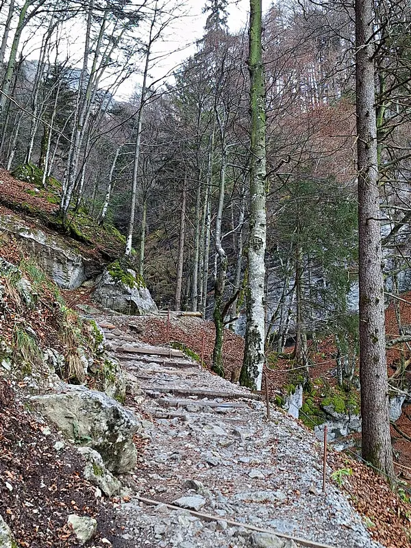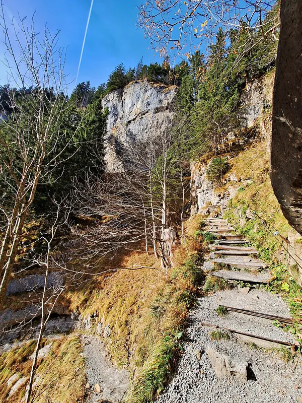 Der Weg vom See hinauf zum Berggasthaus Aescher verläuft steil am Felshang in vielen Kehren aufwärts, teilweise recht felsig. Er ist an zahlreichen Stellen gut gesichert. Bäume verdecken meist die Sicht nach unten, was ein angenehmes Gefühl von Sicherheit vermittelt, auch wenn es wohl trügerisch ist. Fallen möchte ich hier auf keinen Fall.