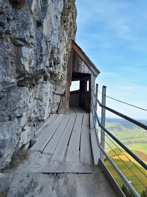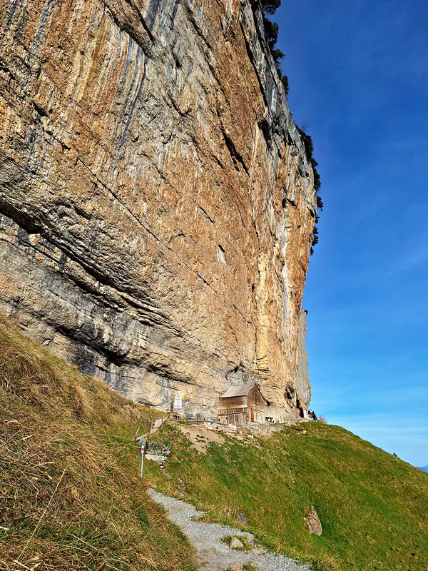 Vom Aescher geht dann ein guter und breiter Weg erst am Felshang entlang zum Wildkirchli. Dann schlängelt sich ein Gang durch eine beleuchtete Karsthöhle und schließlich steil hinauf zum Berggasthaus Ebenalp.