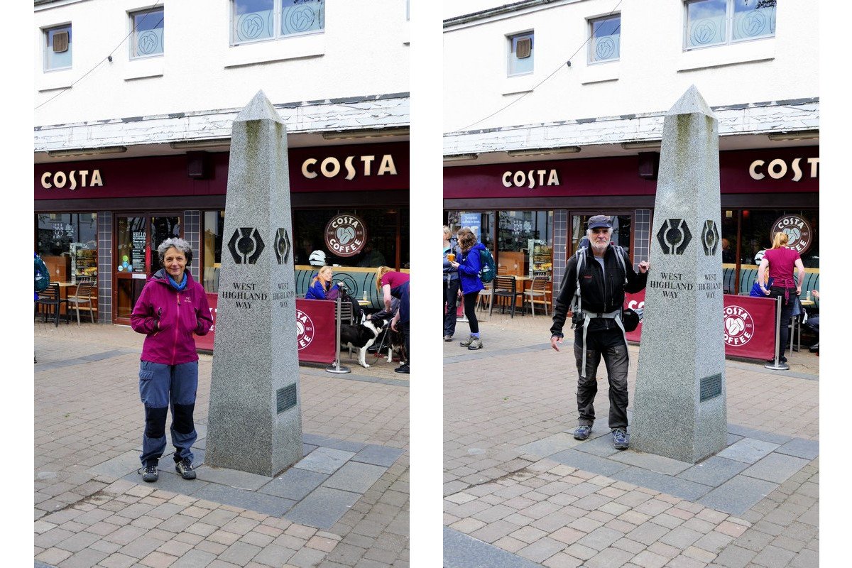 Früh am Sonntag, unserem ersten Wandertag, genießen wir im Hotel ein gutes Frühstück, dann wird noch im Supermarkt in der Innenstadt eingekauft – und dann geht es los. Nein, erst kommen noch die obligatorischen Fotos von der Granitsäule, dem offiziellen Startpunkt des West Highland Way in Milngavie. Aber dann geht es wirklich los.