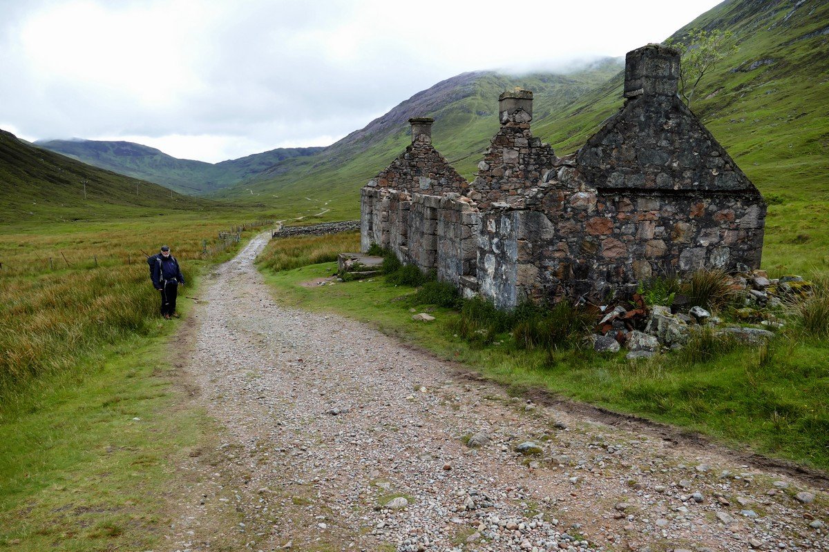 Kurz nach dem Pass sehen wir dann das Bild, welches in fast allen Berichten über den West Highland Way gezeigt wird: die Ruine der Farm Tigh na Sleubhaich. Natürlich gibt es dieses Bild auch von uns (zum Vergrößern anklicken):