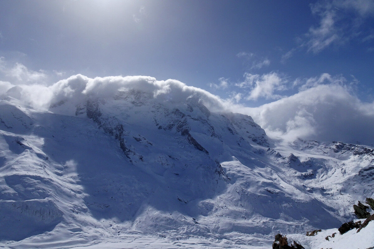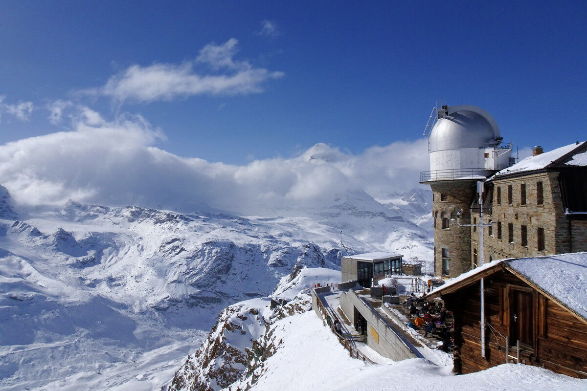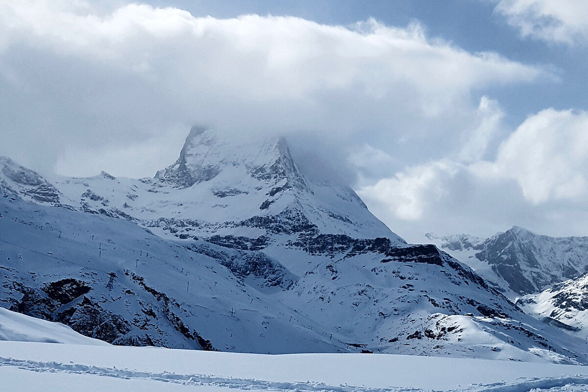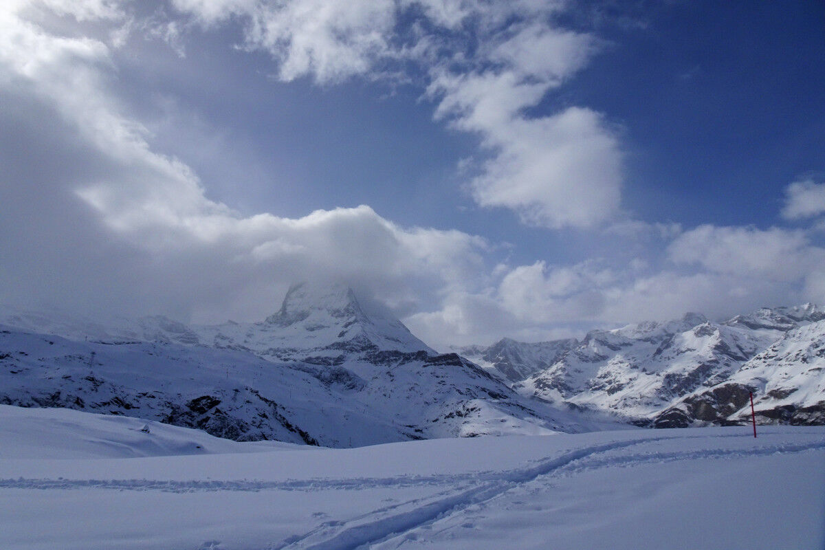 Eine Winterwanderung auf dem Gornergrat im Angesicht des Matterhorns – das ist unser Wintermärchen. Der präparierte Winterwanderweg beginnt auf dem Rotenboden, der vorletzten Station der Gornergrat-Zahnradbahn. Auch wenn sich das Matterhorn heute nicht wirklich zeigen mag, die Aussicht rundum auf die verschneiten Viertausender ist unbeschreiblich schön. In lockeren Kehren geht es hinunter zum Riffelberg und der dortigen Station der Gornergratbahn.
